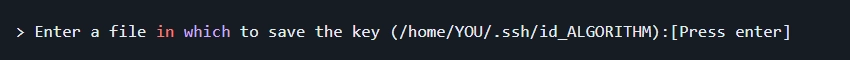 در این مرحله از شما ادرس برای ساخت فایل ssh key میخواد و به صورت پیش فرض میتوانید Enter را فشار دهید تا از این مرحله گذر کنید و همان ادرس پیش فرض انتخاب شود در غیر این صورت آدرس دلخواه خود را وارد کنید.
